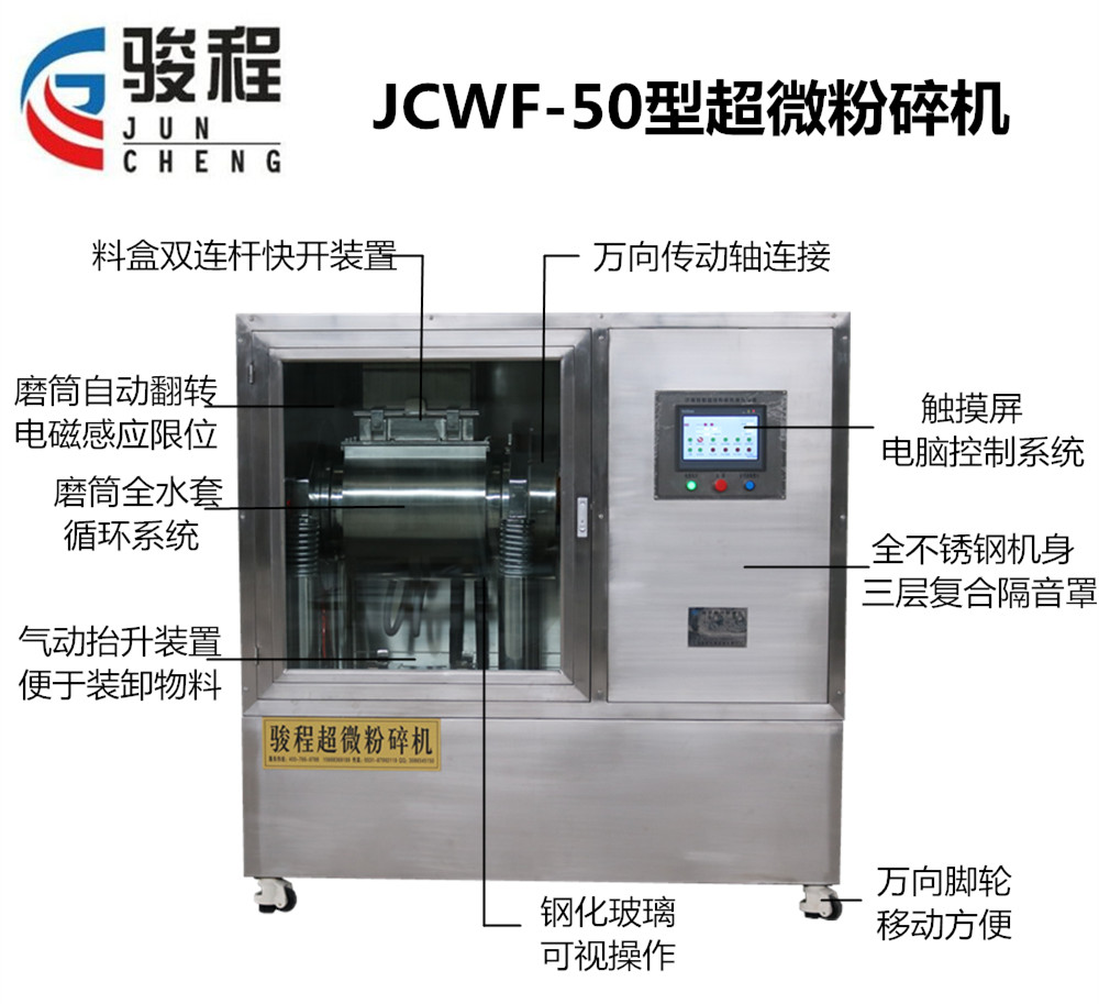濟南駿程JCWF-50型丹參超細粉碎機設備外形設計美觀整潔,嚴格按照產品的技術條款,設計圖紙和有關標準及質量規格進行制造和質量檢驗。符合藥品生產的要求,安全、穩定、可靠,易于清洗、消毒、滅菌,便于生產操作和維修保養。 材質符合食品藥品生產要求,與物料接觸部分均為精加工拋光304不銹鋼材質,材質確保不脫落、不滲透、耐腐蝕、易清潔。 設備內表面及工作零部件表面應進行拋光處理,平整光滑、無死角,易清洗和消毒。設備內外全不銹鋼外觀,采取防塵、防漏、防噪音、隔熱等措施。設備設有 “緊急制動”,操控按鈕具有良好密封,可有效阻止灰塵、水和濕氣進入其中。磨筒制冷循環水套采用全水套設計方式,制冷速度快、效果好。磨筒自動翻轉,自動限位,自動排料,智能化操作。
