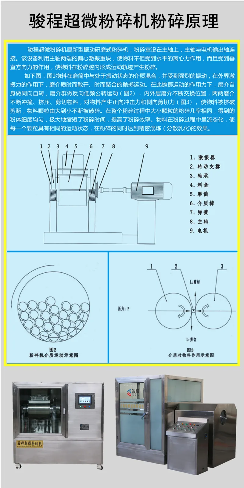 JCWF-130B低溫粉碎機利用高強度的振動,使物料在磨筒內受到高加速度撞擊、剪切、研磨,可在短時間內達到理想的粉碎效果。對于纖維狀、高韌性、高強度、遇熱發粘的物料都可以粉碎至細胞級微粉。全密閉作業,無粉塵污染、無物料損耗。