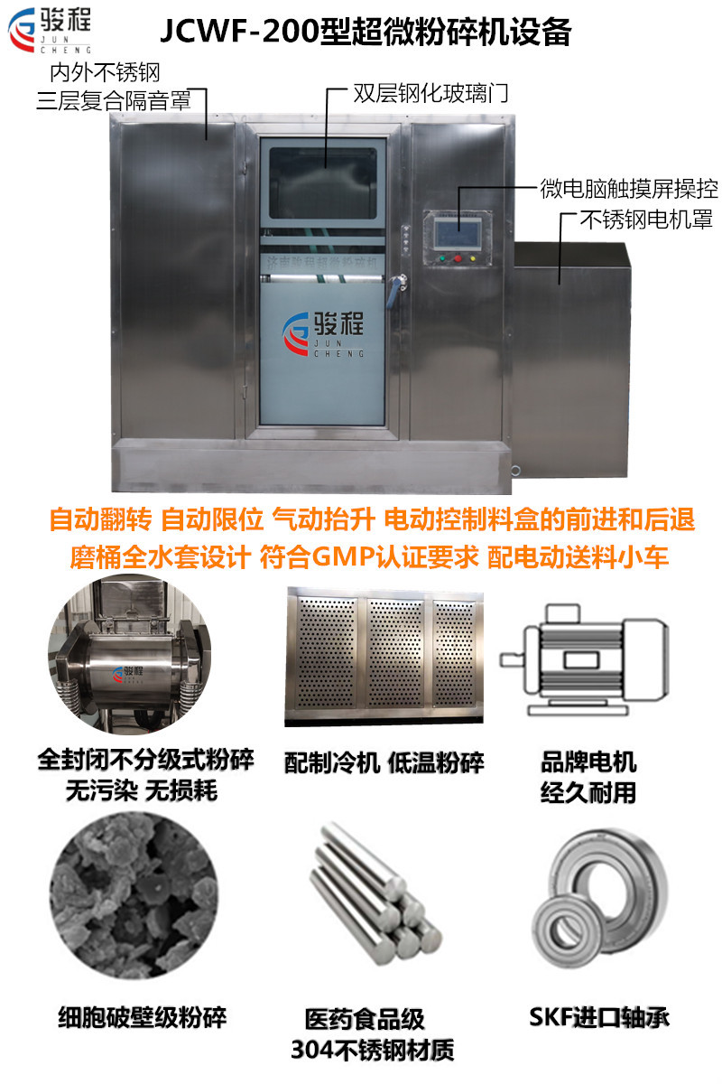 駿程蟲草破壁超微粉碎機能使藥材粒度達到細胞破碎級,使藥物細胞間和細胞內有效成分直接釋放出來,提高藥物中有效成分的溶出速度和溶出率。采用全封閉多磨不篩技術粉碎,一次成粉,無余渣、無損耗。所得超微粉純度高、防止成份偏析及損失。選用低溫功能,粉碎設備能連續生產,保證了物料的色澤、品質、成分,可使升溫后軟化或發粘的藥物易于粉碎。