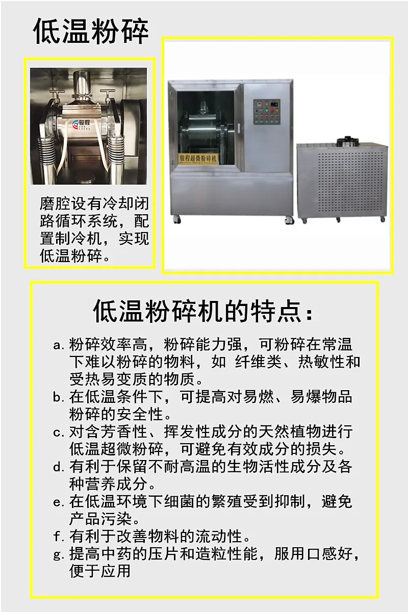 5.解決了中藥超微粉碎過程中的升溫問題,保留不耐高溫的生物活性成分及各種營(yíng)養(yǎng)成分。
